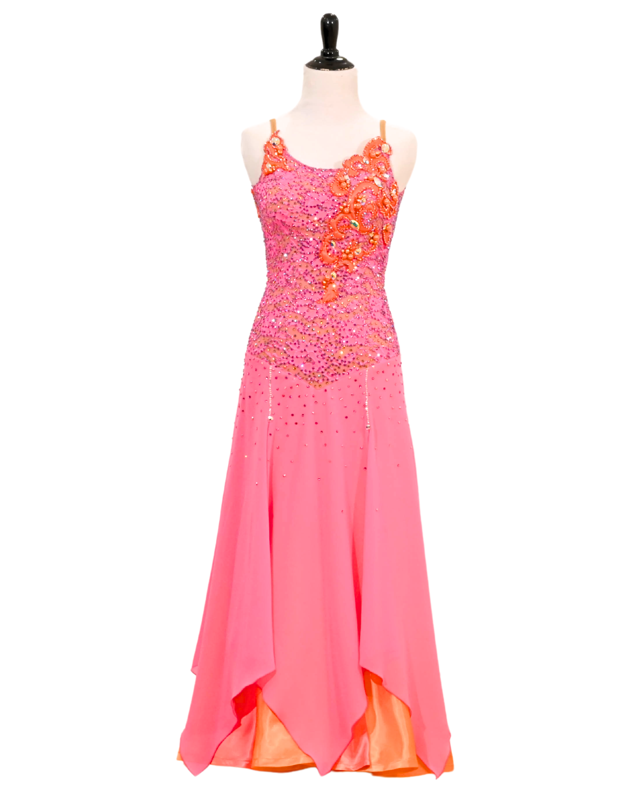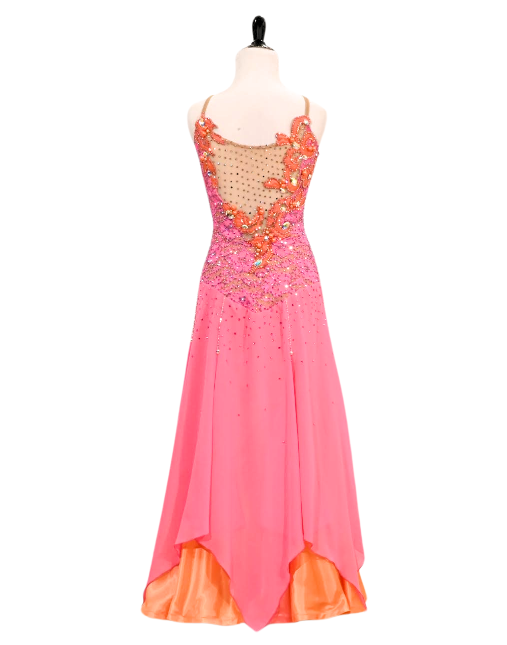 Radiate the warmth of a tropical sunset in Hibiscus Kiss, an enchanting Smooth dress that marries delicate femininity with vibrant, sun-drenched color. The design features a fitted lace overlay bodice in a soft petal-pink hue, meticulously crystallized and anchored by exquisite, asymmetrical orange floral appliqués that bloom across the neckline, the shoulders, and climb gracefully from the waist. This intricate floral motif is mirrored on the back, creating continuity and framing a sheer illusion-mesh panel that adds a touch of modern allure while maintaining a classic, regal silhouette. Transitioning from the embellished torso, the skirt falls into a fluid, multi-layered display of pink chiffon with a sharp, handkerchief hemline that reveals a striking underlayer of vibrant orange, ensuring that every movement is punctuated by a joyful flash of contrasting color.